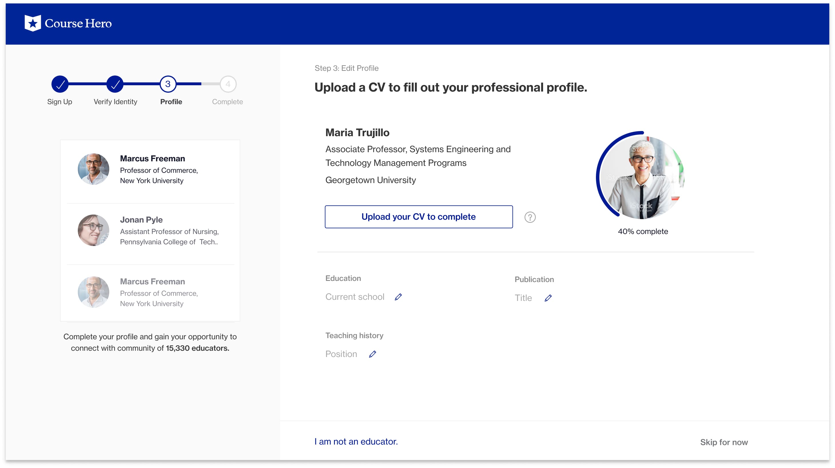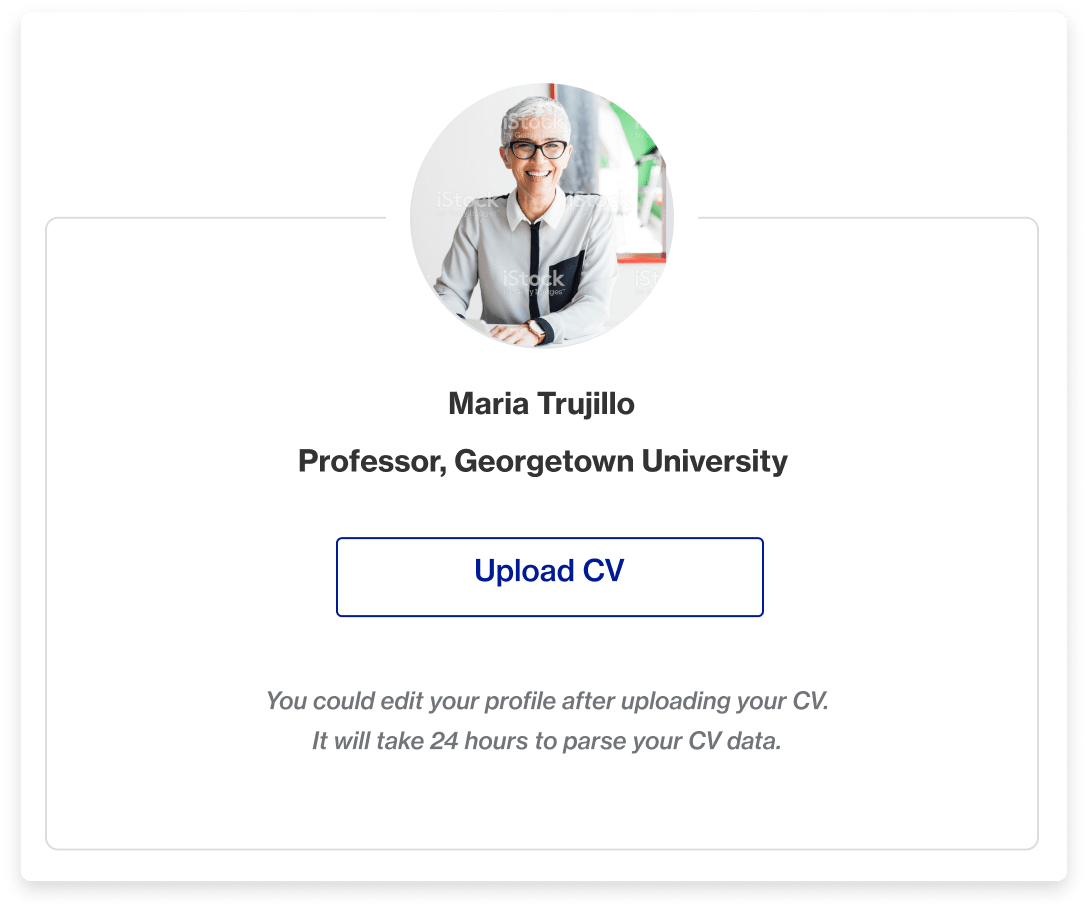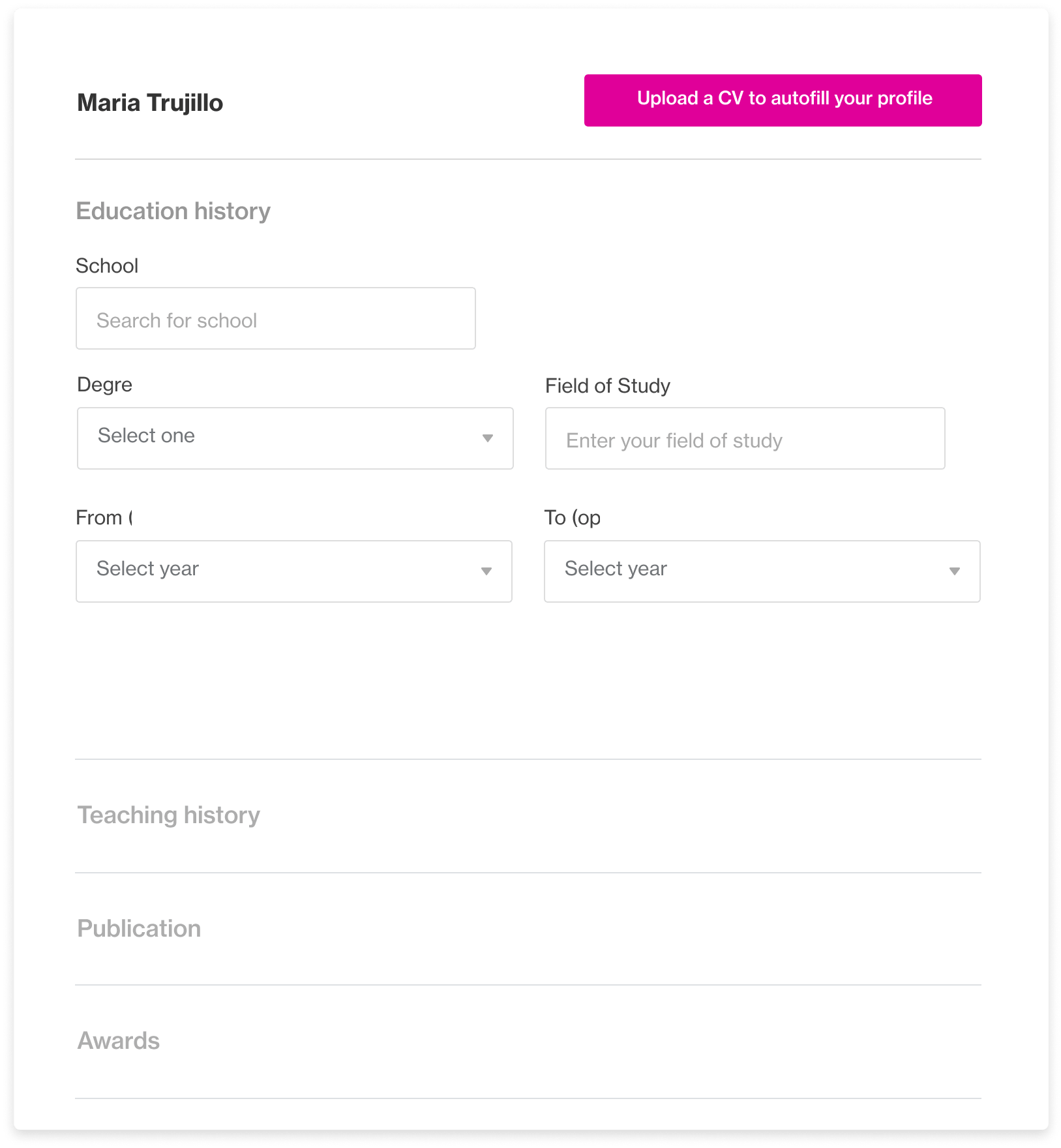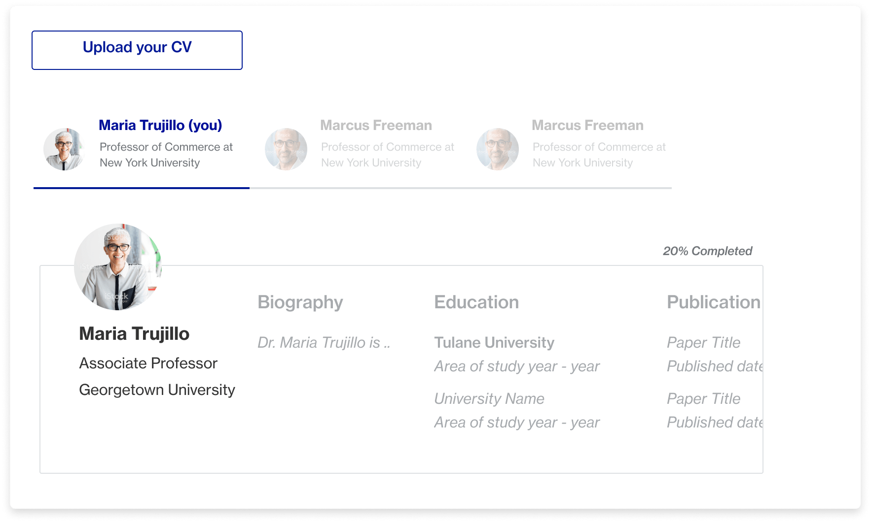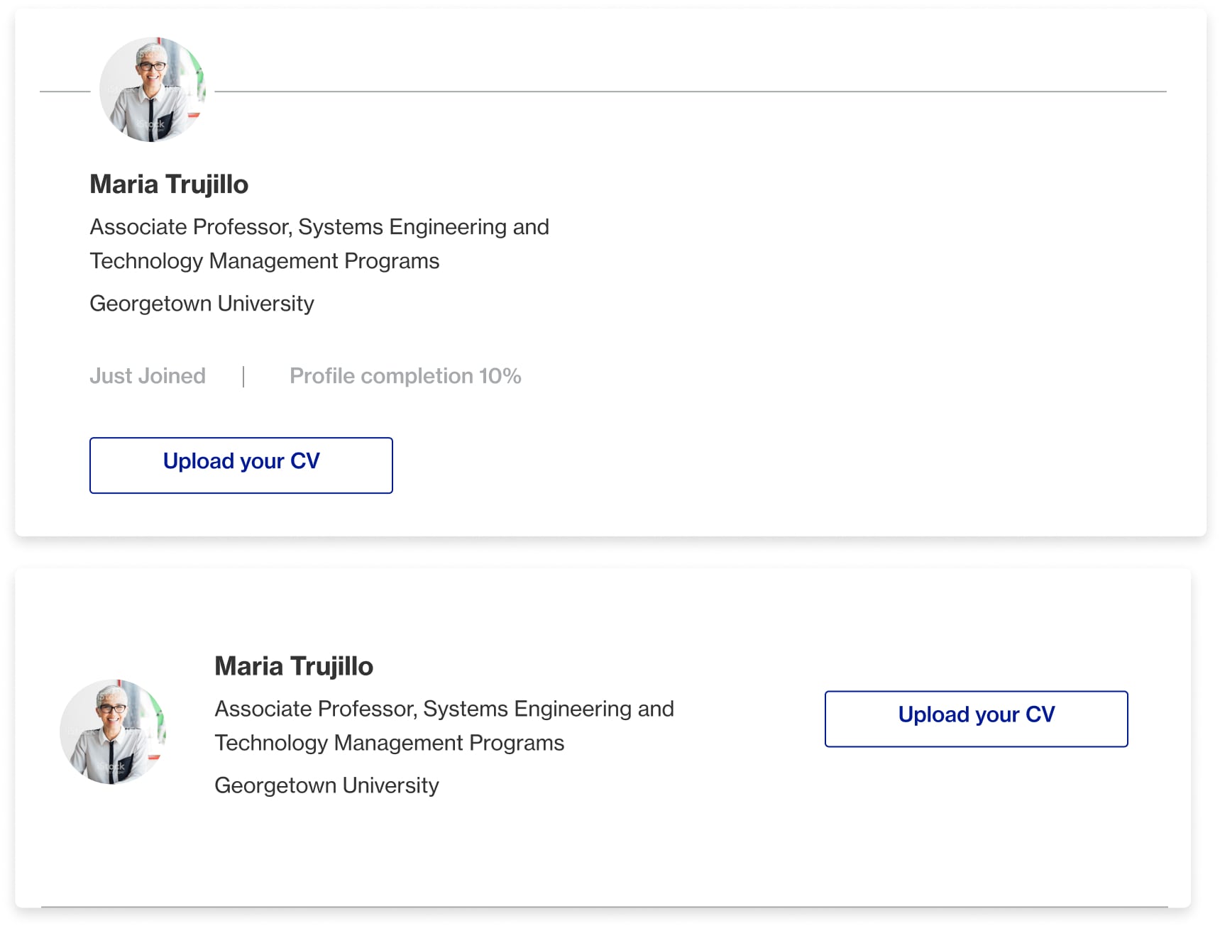 After launch, through data tracking, we found out that out of the users who interact with this step, 40% of the them upload a CV, 40% of the user fill in one field. No one fill in their publications. We decided to prioritize the CV parser CTA, and introduce a second approach - Enter a profession link to auto fill the profile, and explain the value of a profile completion.