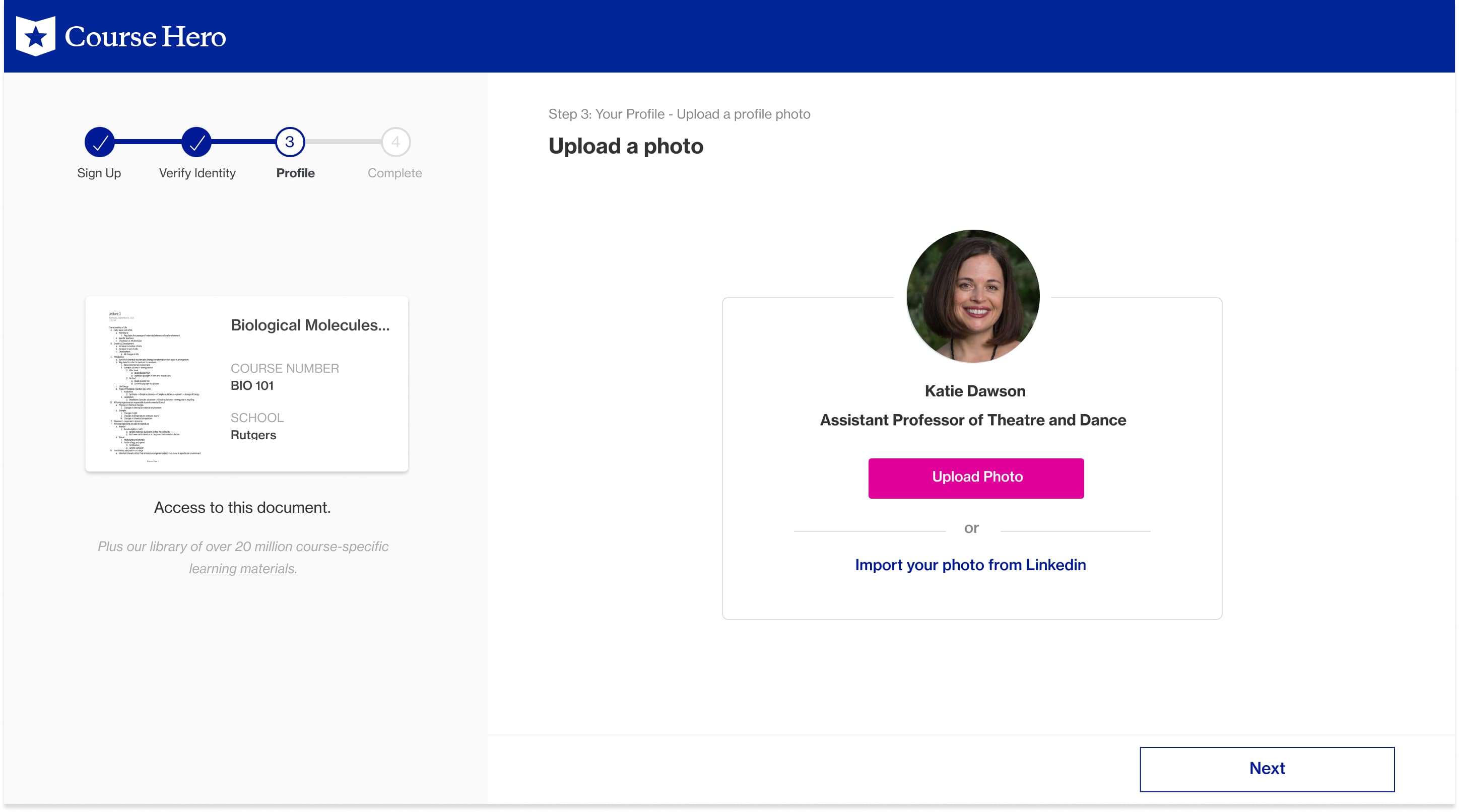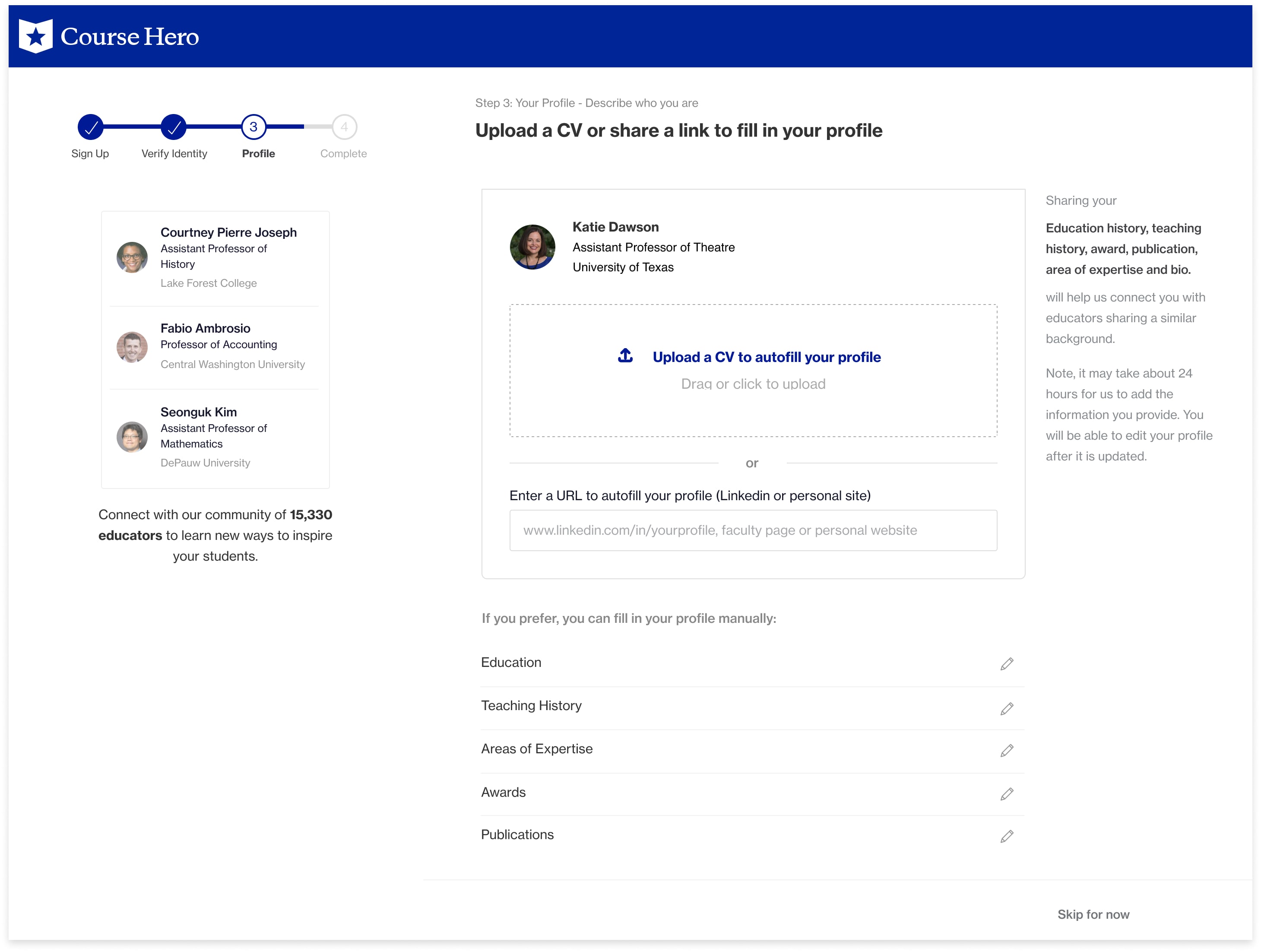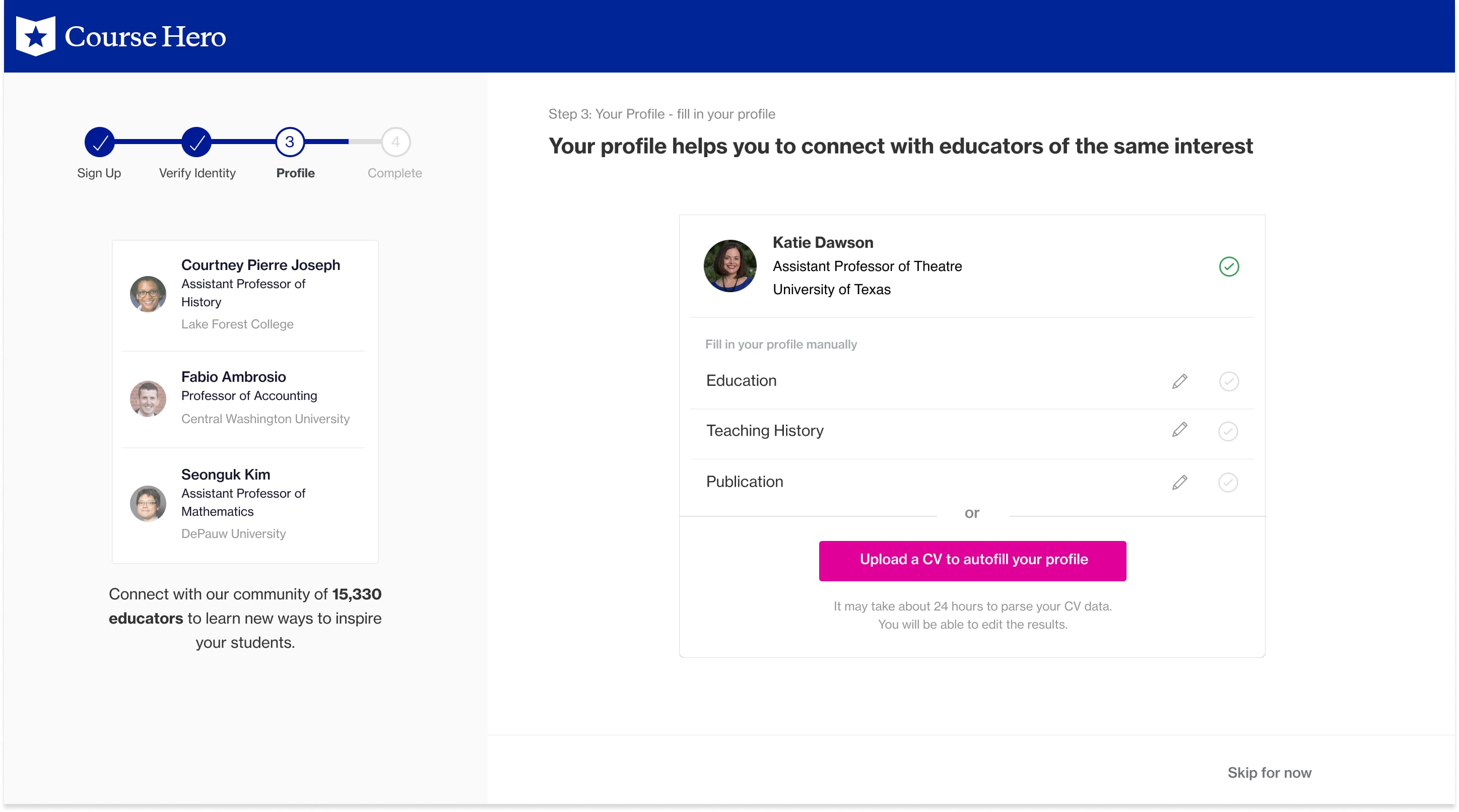 Filling out eight information: School, Degree, Field of Study, Area of Expertise, Course teaching, Publication, Award, Profile Photo takes time, not to mention the lack of motivation when they are asked to complete the tasks.