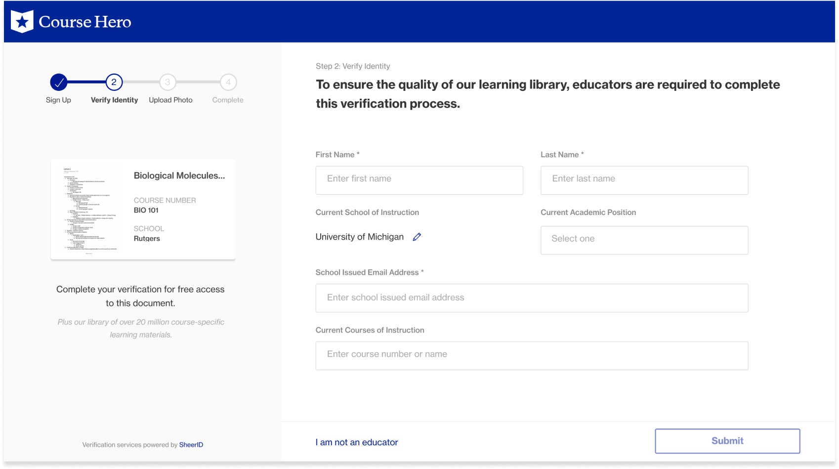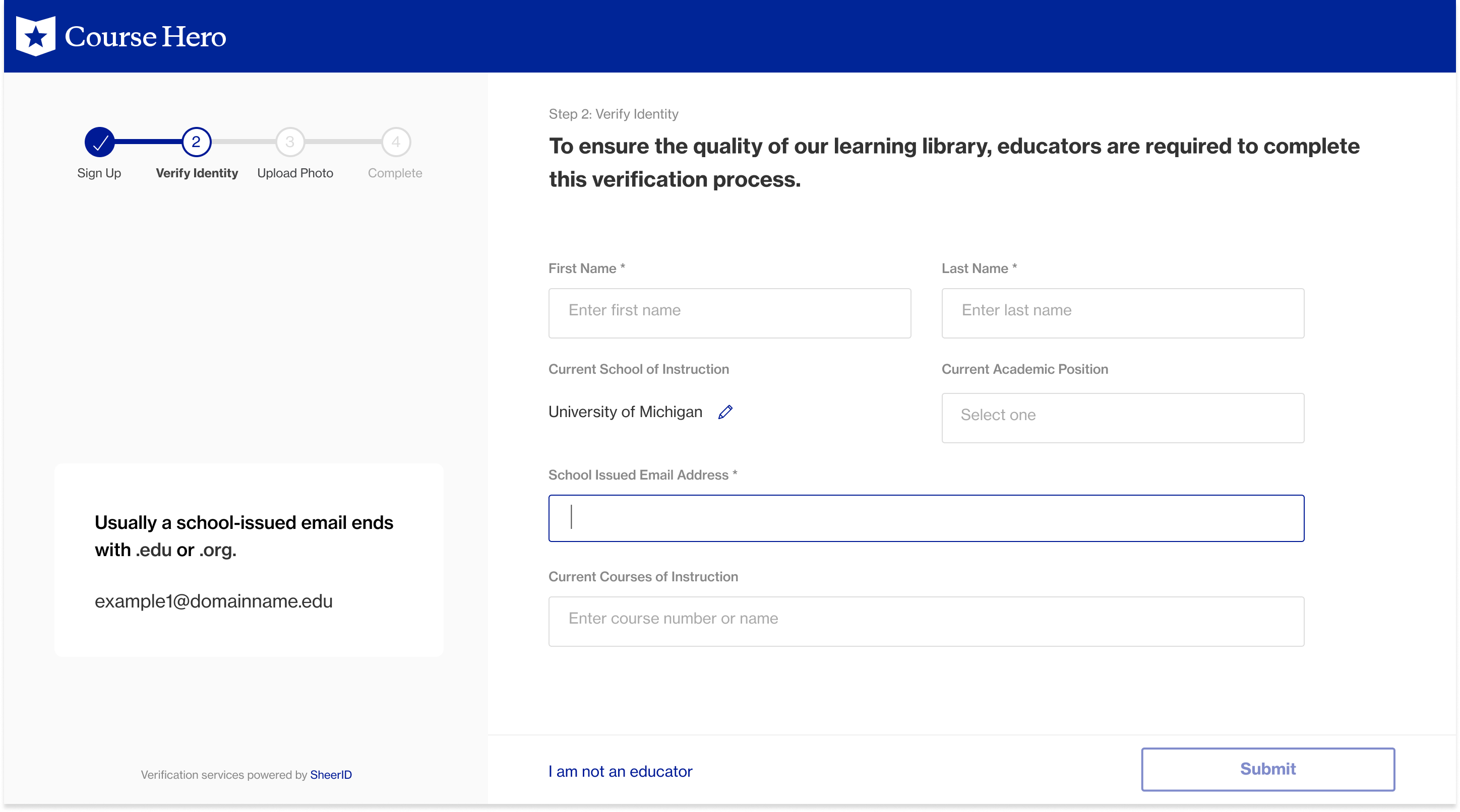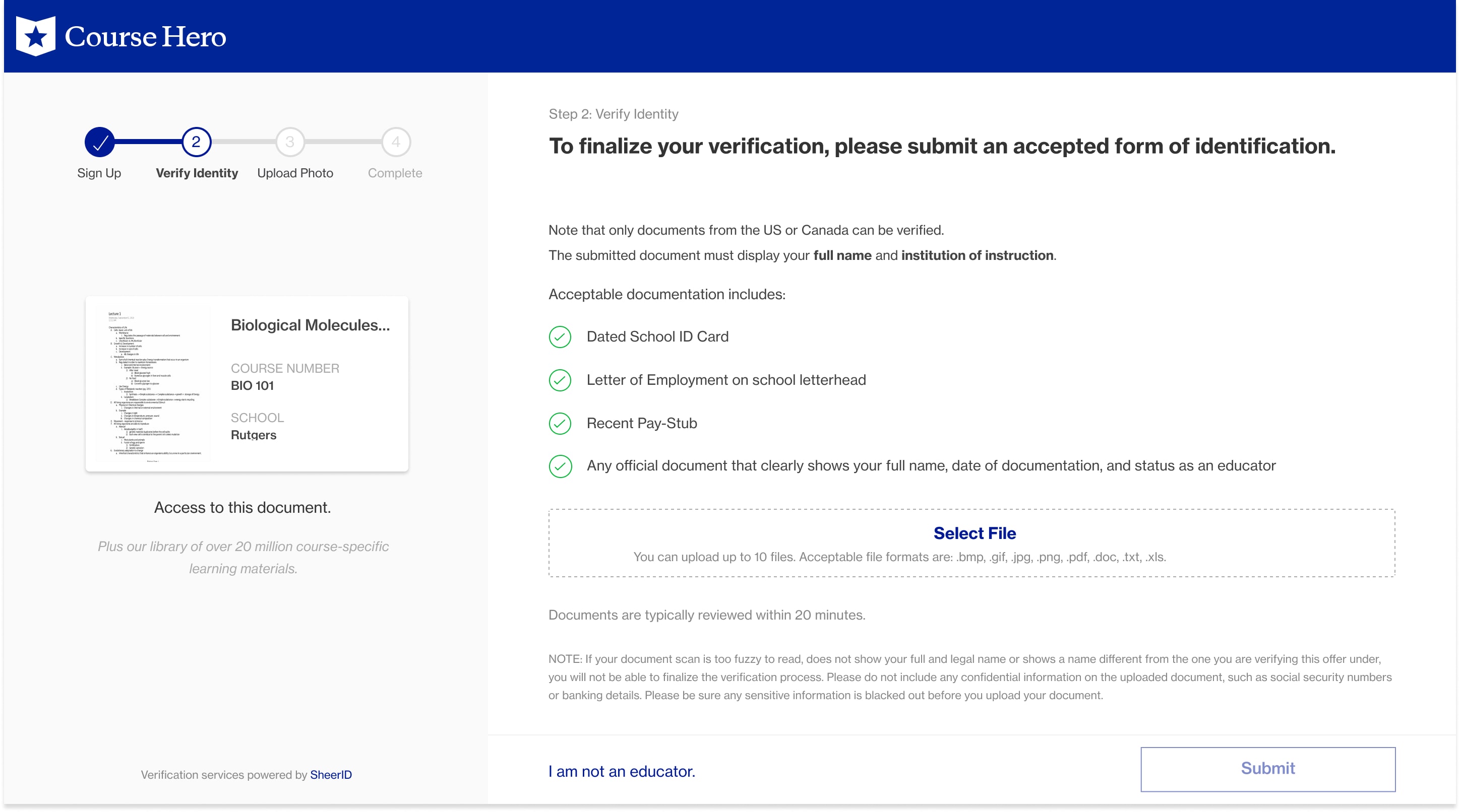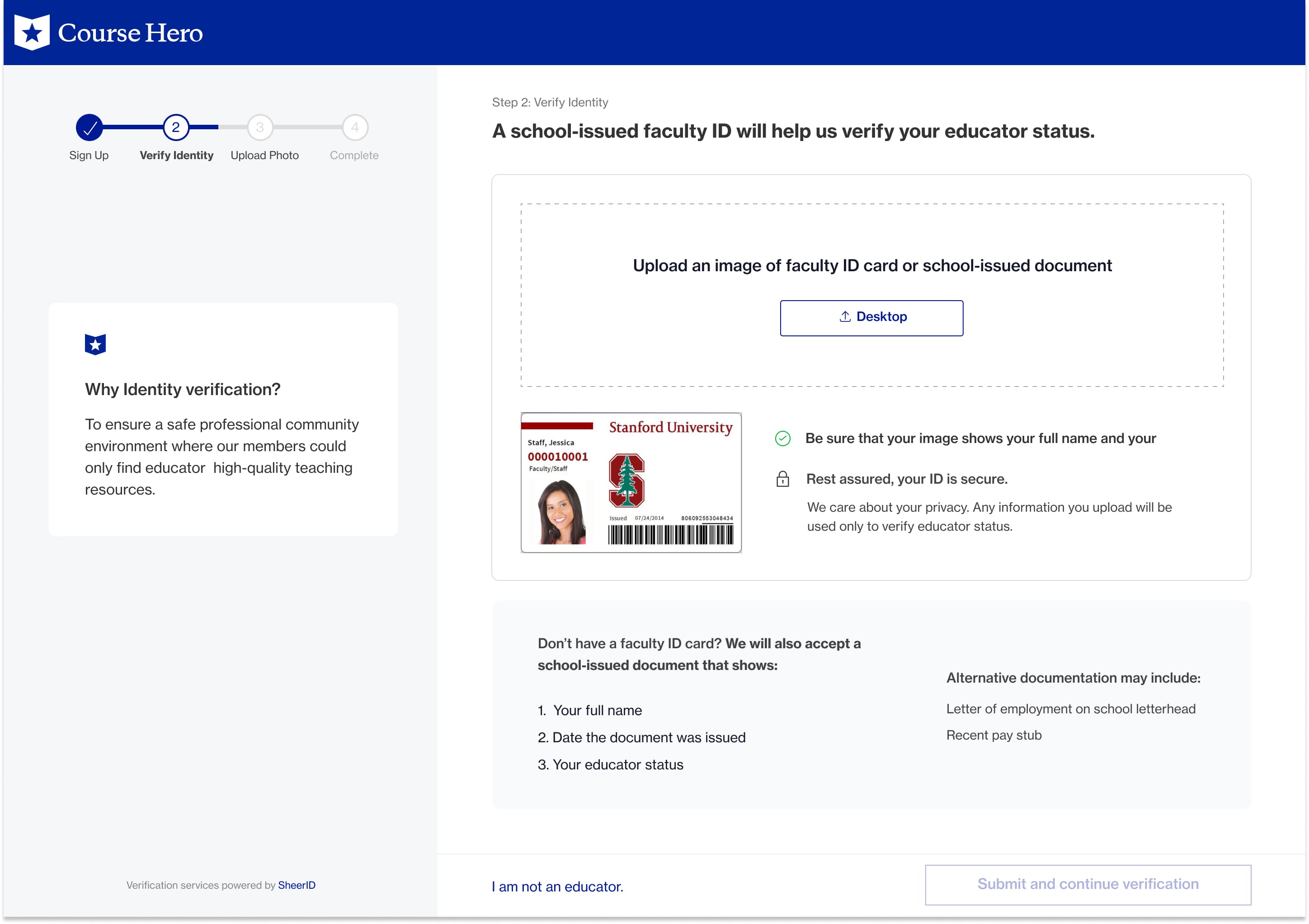 Our users don’t feel secured about our process. To them, Course Hero is a website which they first encounter. They regard their faculty ID and their school-issued email their own school properties. They also describe the uncertainty of what to upload for verification, and question of why Course Hero need a verification process.